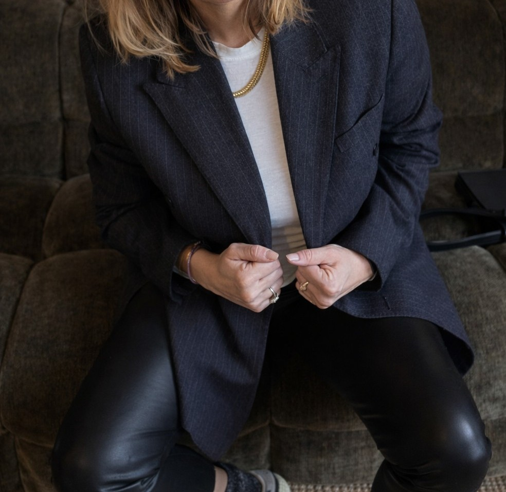 Ce blazer vintage taille 38 bleu marine à rayures tennis en est le parfait exemple : une pièce structurante, intemporelle et facile à intégrer dans un vestiaire du quotidien.